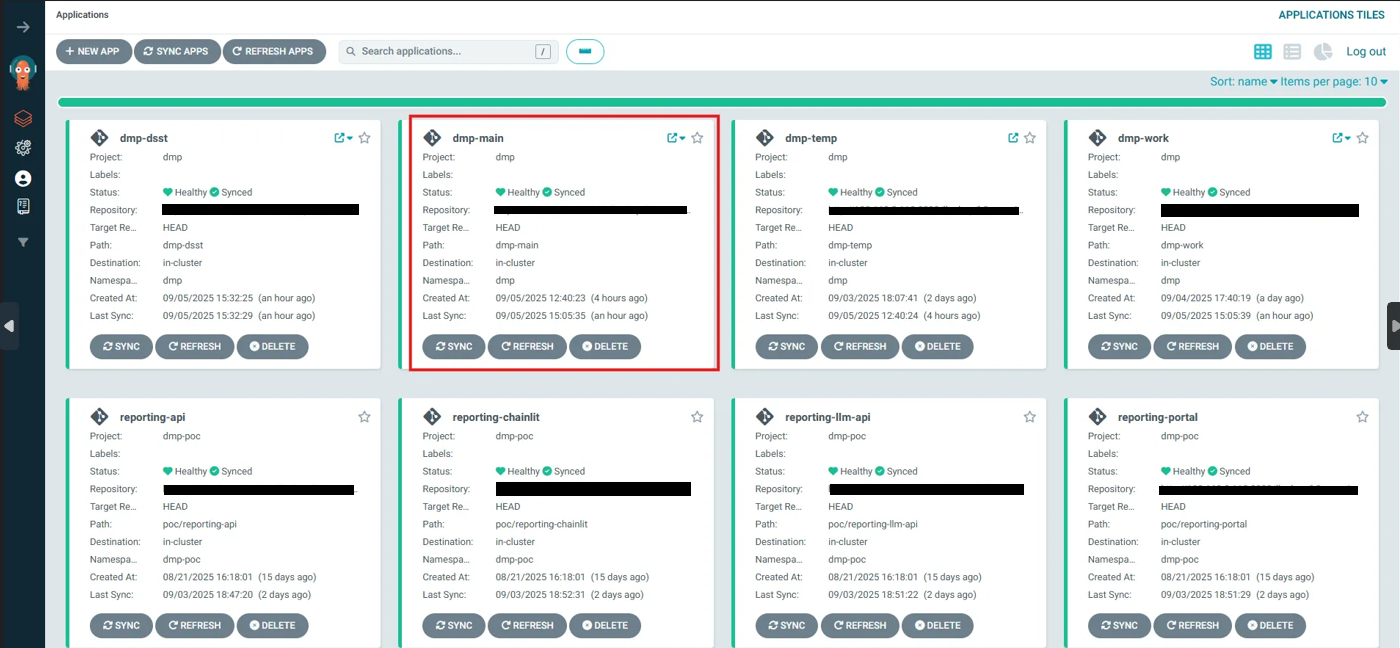 기존에는 서비스마다 ArgoCD Application이 하나씩 있어서, dmp-main, dmp-work, reporting-api 등 14개의 App을 개별로 관리해야 했습니다.