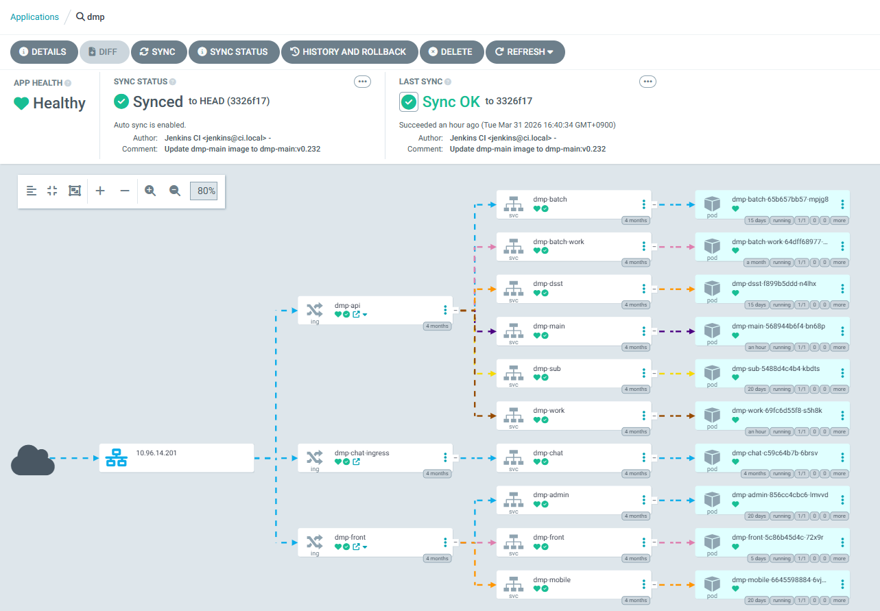 dmp 네임스페이스 — 하나의 dmp Application에서 10개 서비스의 Deployment, Service, PVC, Ingress 전체를 관리: