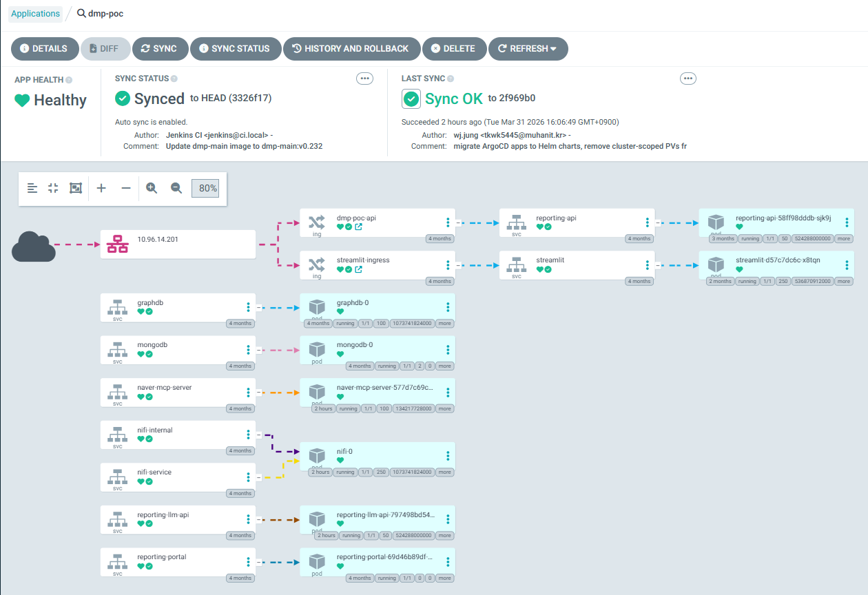ArgoCD 대시보드에서 한눈에 네임스페이스 전체 상태를 볼 수 있게 되었고, 리소스 간 관계도 트리로 파악할 수 있어서 운영 편의성이 확실히 좋아졌습니다.