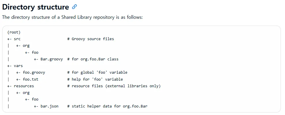• vars/: 전역으로 사용할 수 있는 Groovy 스크립트(함수, 파이프라인 스텝)