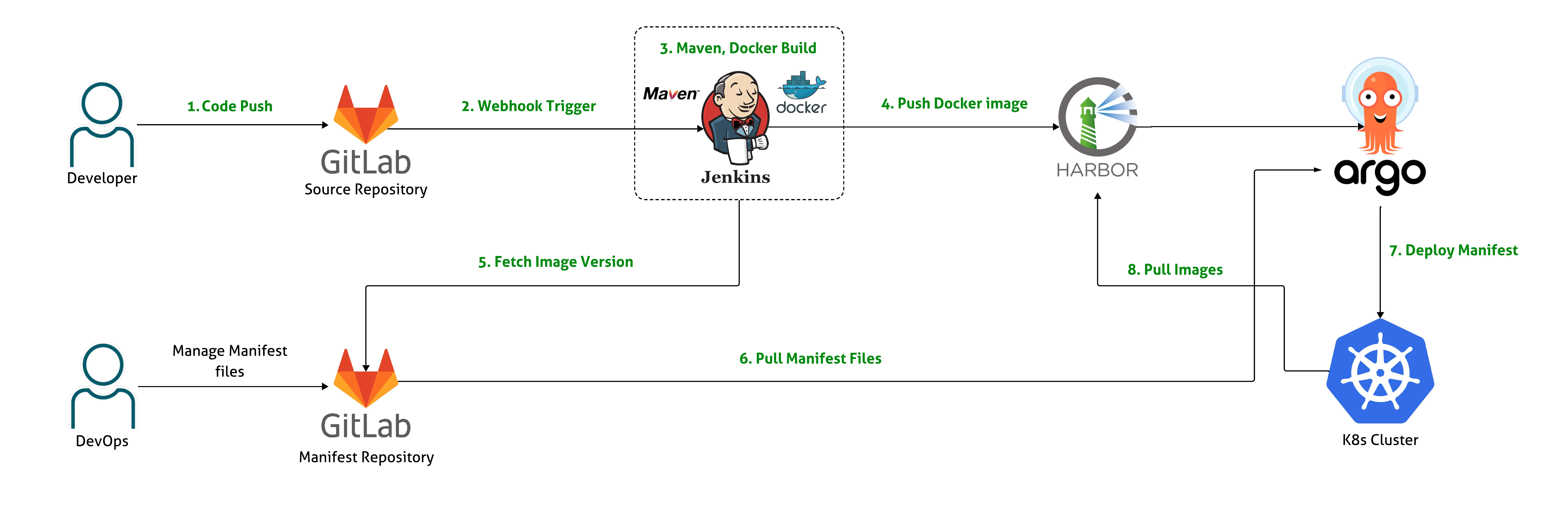 설명: manifest yaml의 이미지 태그만 새로 빌드된 태그로 치환하는 간단한 예시입니다. 실제 운영에서는 git push, PR 생성 등 추가 작업이 필요합니다. 이렇게 manifest가 변경되면 ArgoCD 같은 GitOps 툴이 변경을 감지해 자동으로 배포를 트리거합니다.