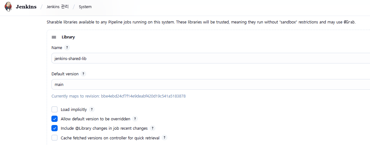 1. Jenkins 관리 > Configure System(시스템 설정) > Global Shared Libraries