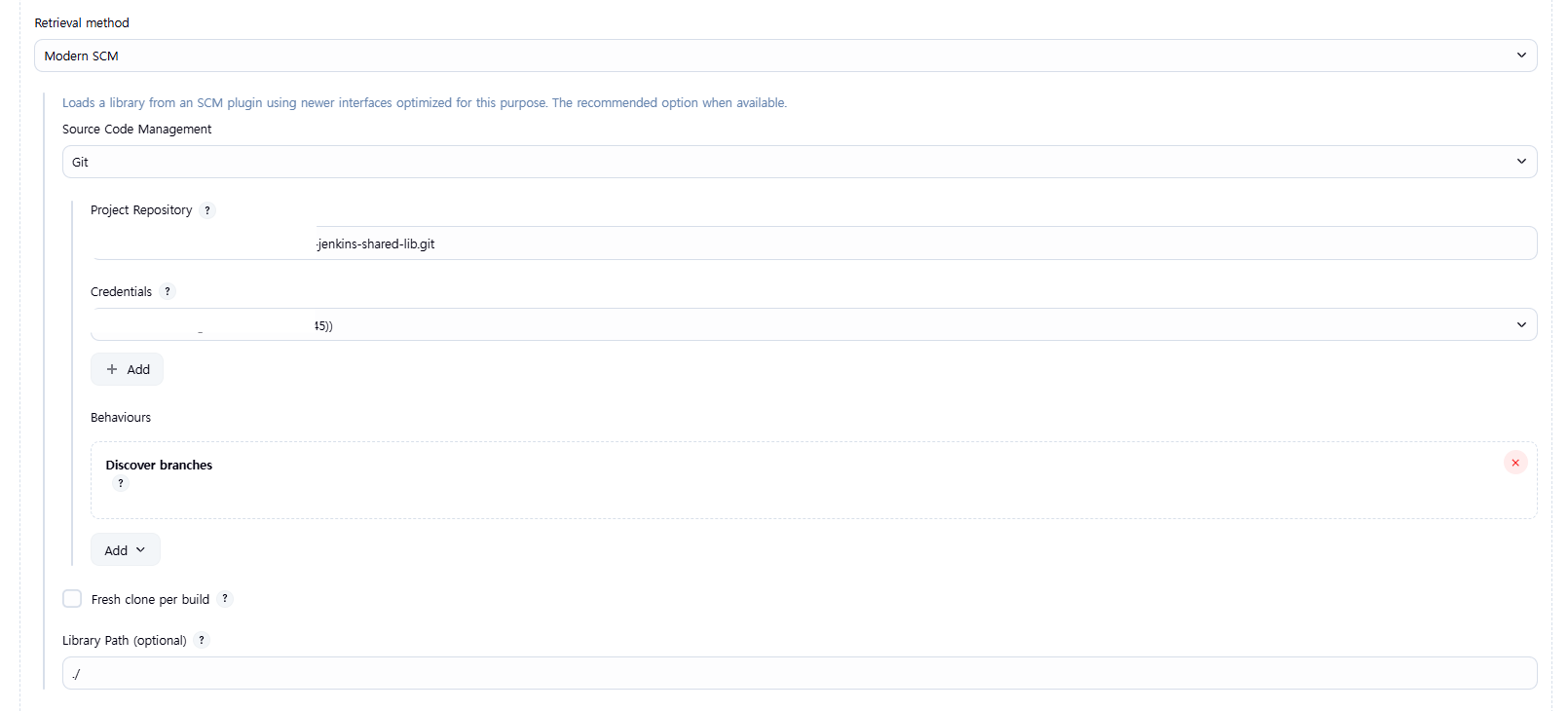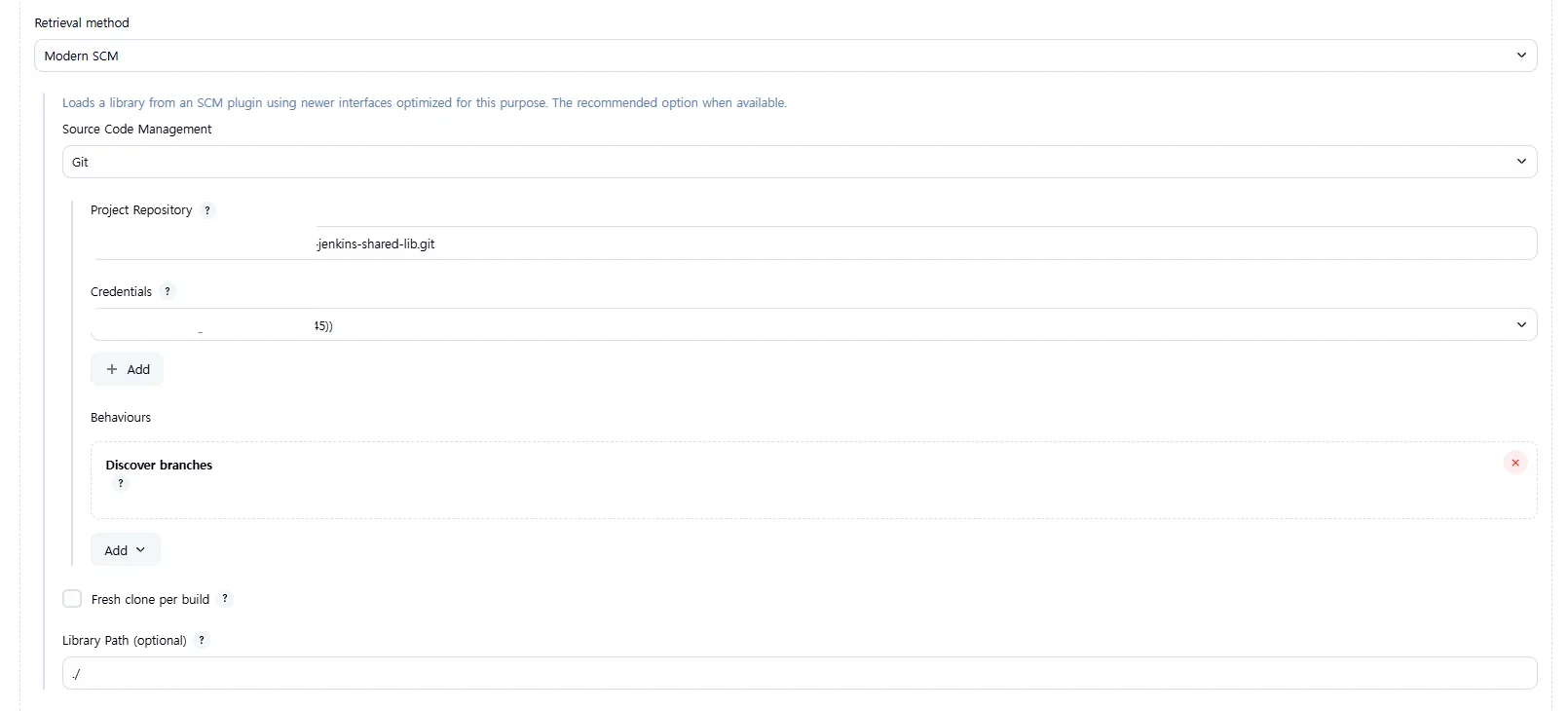 • Library name에 사용할 이름(예: jenkins-shared-lib)을 입력합니다.
