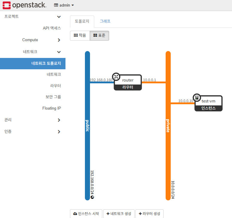 네트워크와 VM을 생성 한 후 최종적으로 네트워크 토폴로지를 확인 합니다.