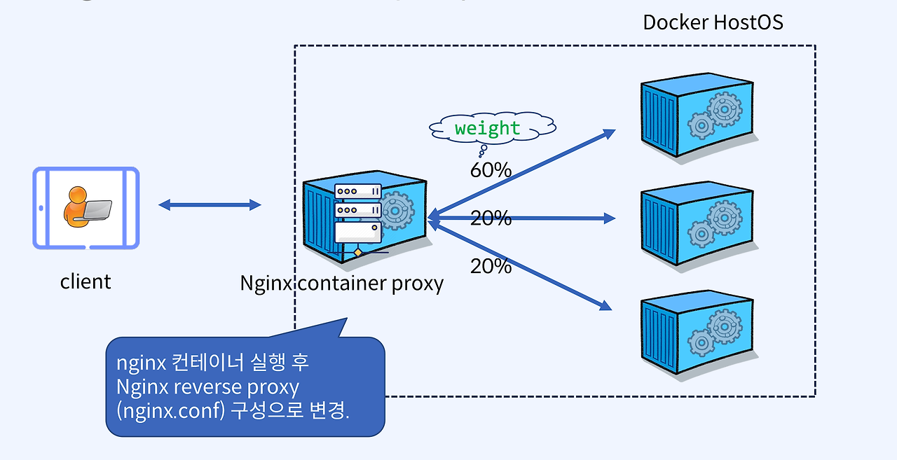 Docker 환경에서 Nginx를 이용한 Reverse Proxy 설정 및 로드밸런싱 구현 실습.
