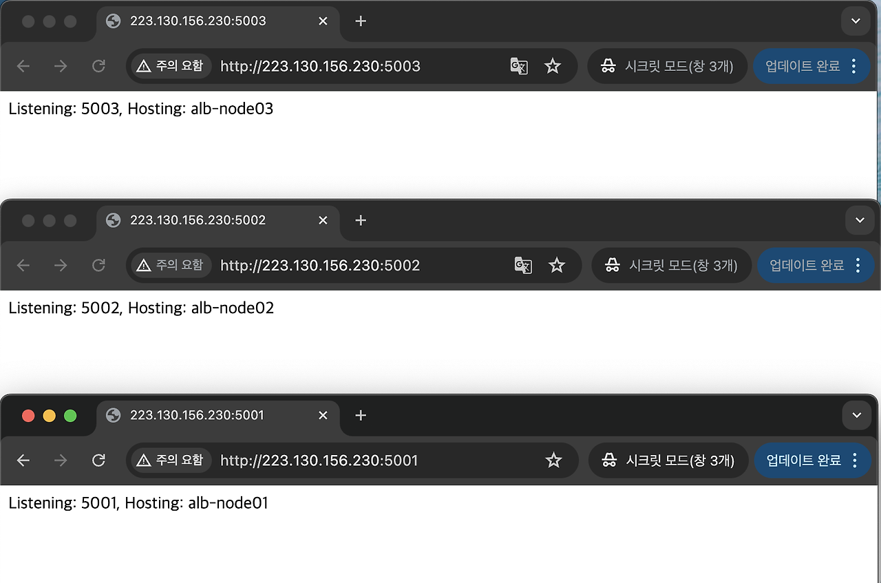 → 요청이 각 컨테이너로 Round-Robin 방식으로 분산되어 응답이 달라짐